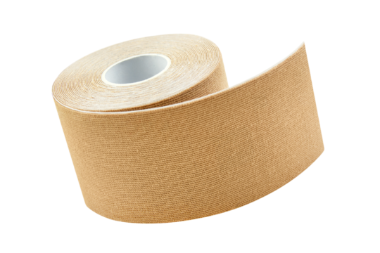 Roll of beige kinesiology tape on a transparent background. Concept of sports medicine and injury recovery.