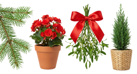 Christmas Plants: Fir Branch, Red Begonia, Mistletoe with Bow, Mini Cypress Tree