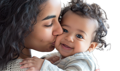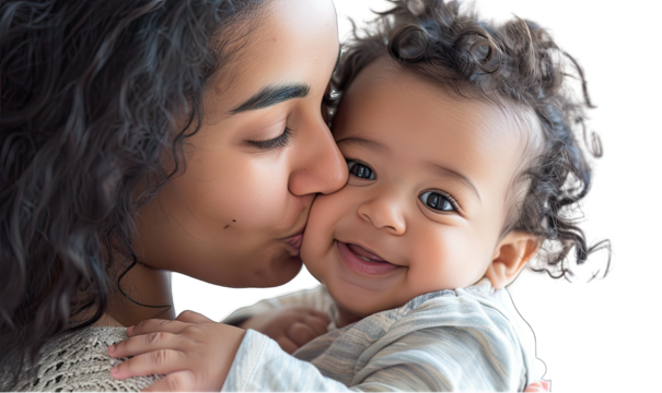 Mother kissing her baby gently on the cheek on a transparent background, cut out