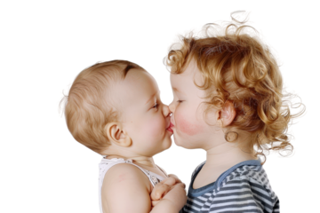 Children, brother and sister siblings kiss on cheek in family portrait with love and care. Kids, hug and smile together with support for boy and girl on an isolated png, transparent background.