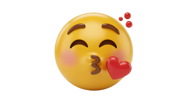 Cheerful yellow 3D emoji face blowing a kiss with red heart and bubbles on a black background conveying a loving mood with soft lighting