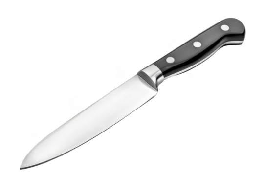 Sharp kitchen knife with a black handle and stainless steel blade isolated on a white background