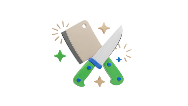 3D Crossed Kitchen Knives and Cleaver with Sparkles Icon on transparent background