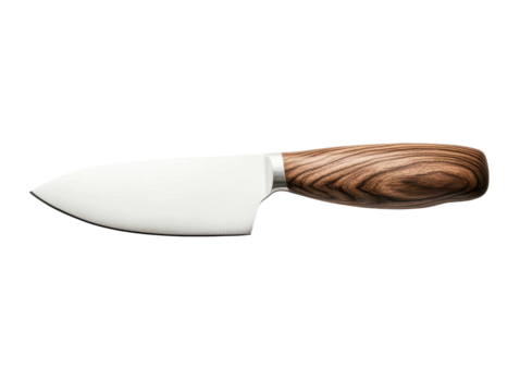 Professional kitchen knife with a polished steel blade and a unique wood handle cutout on transparent background