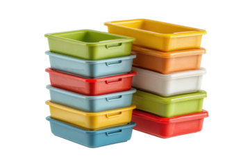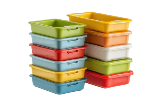 PNG Stacked colorful plastic storage containers in various sizes