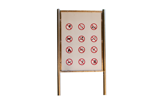 White sign symbol icon prohibit of No kite flying, no fishing, no electric scooters, no pets, no volleyball, no fires, no cycling, no diving, no swimming, no serving. Isolated on cutout PNG.