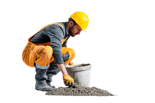 Construction worker wearing a helmet and gloves, kneeling on the ground, preparing materials for building projects.