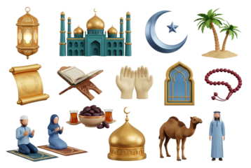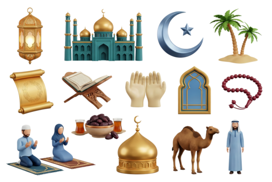 Ramadan Islamic Symbols Collection: Mosque, Quran, Dates, Camel, Prayers