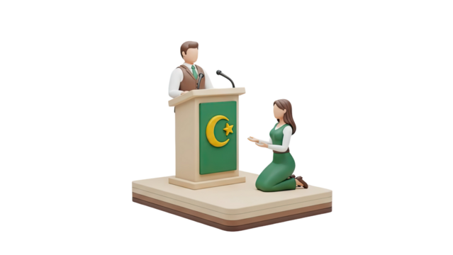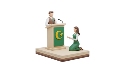 3D Man at Podium Addresses Kneeling Woman with Crescent Moon Symbol on transparent background