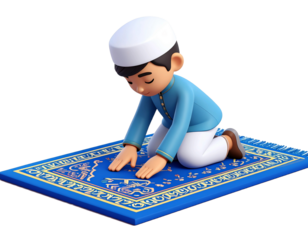 Young Muslim boy in prayer, seeking spiritual peace on a beautifully patterned prayer rug.