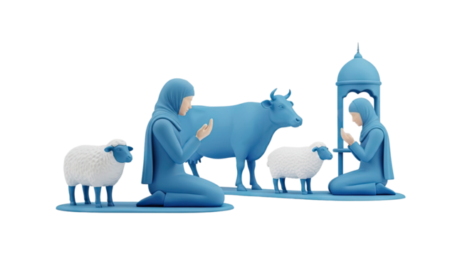 3D Islamic Sacrifice Illustration with Prayer and Animals on transparent background