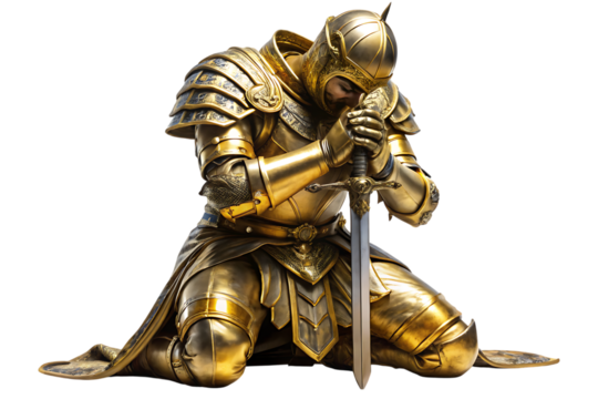 Golden Knight Kneeling with Sword on White Background isolated on a transparent background armor