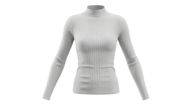 A white ribbed knit turtleneck sweater with long sleeves presents a clean and modern apparel option on a transparent background.