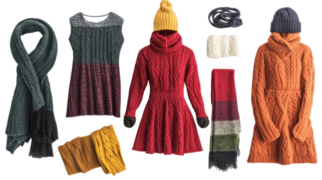 Cozy winter knitwear collection: scarves, hats, gloves, sweaters on transparent background