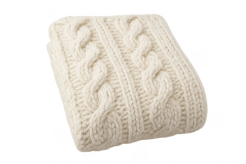 Rolled up chunky knit blanket in cream color against a studio on transparent background