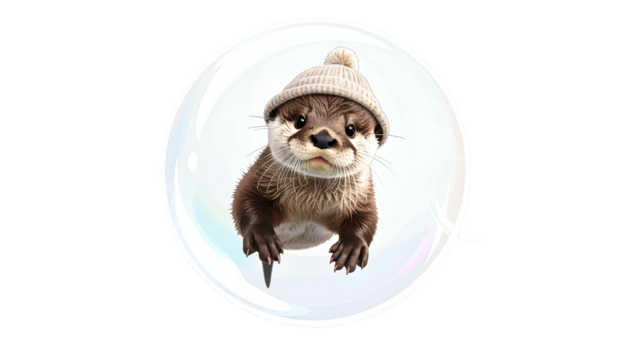 A whimsical image featuring a cute otter wearing a knit cap inside a large soap bubble