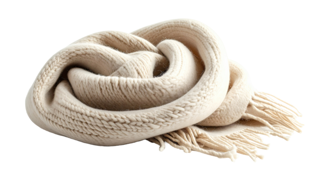 Soft beige knitted wool throw blanket with decorative tassels isolated on a transparent background