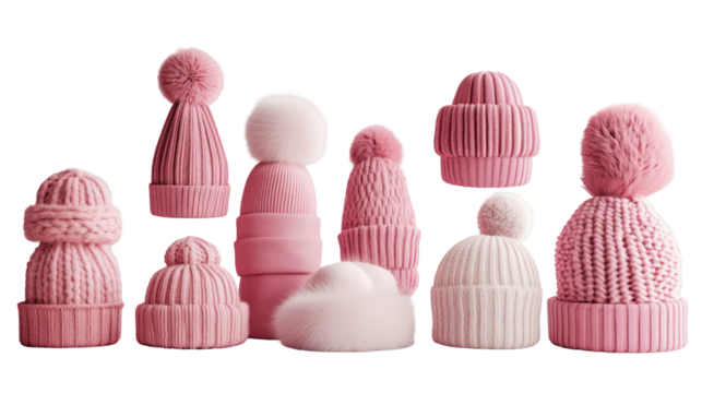 Collection of knitted winter hats with pom poms, various styles and colors, isolated on transparent background