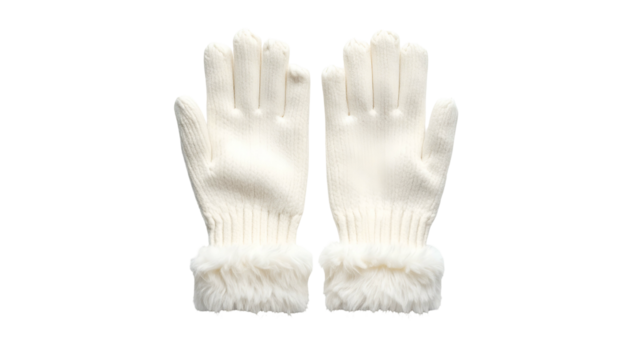 Cream knitted wool gloves with cable knit pattern and decorative trim isolated on a transparent background