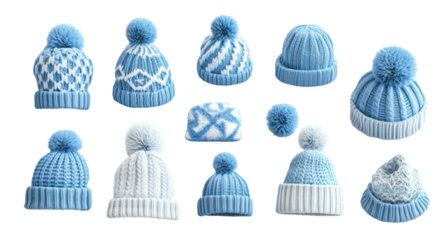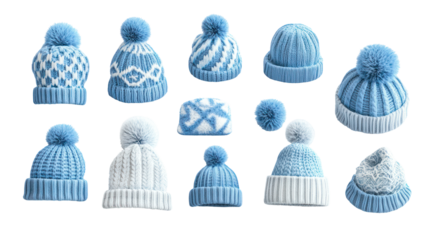 Collection of knitted winter hats with pom poms, isolated on transparent background