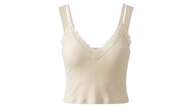 Ribbed knit camisole with lace trim isolated PNG on transparent background, stylish summer top for fashion and apparel design