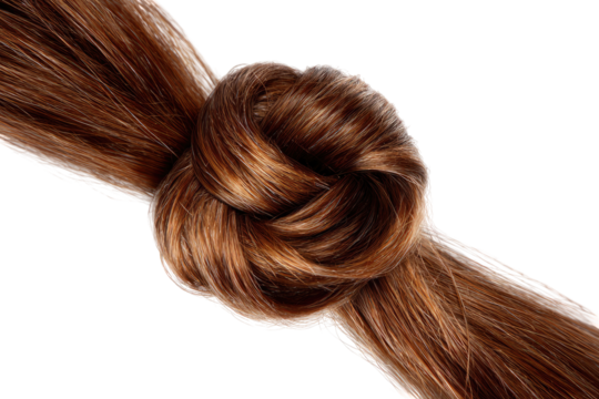 Close-up of a tightly knotted strand of brown hair