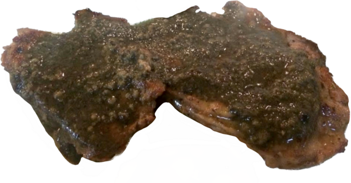 Three pieces of meat stacked on top of each other. The meat is brown and has a lot of fat