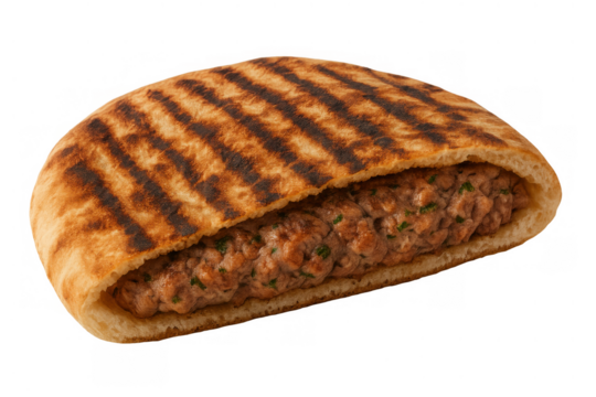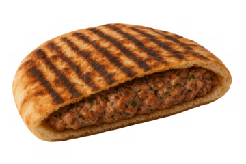 Arayes, middle eastern grilled pita bread filled with spiced ground meat, a popular street food sandwich, transparent background
