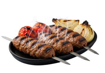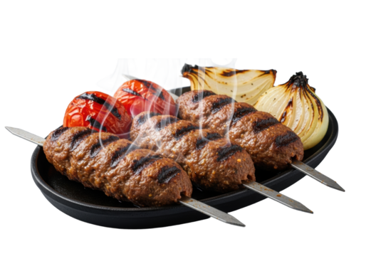 Sizzling beef kofta kebabs with char marks and glistening juices on a hot cast-iron platter, alongside grilled tomatoes and onions, against a transparent studio background. Concept for appetizing food