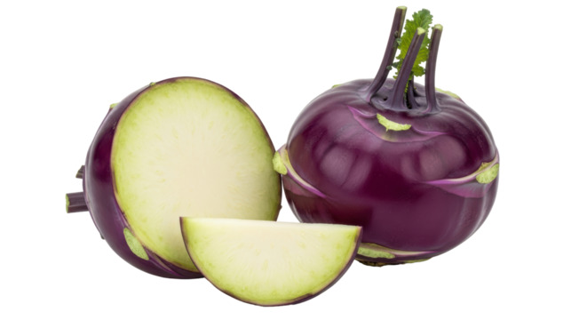 Purple kohlrabi vegetable with green leaves isolated on transparent background