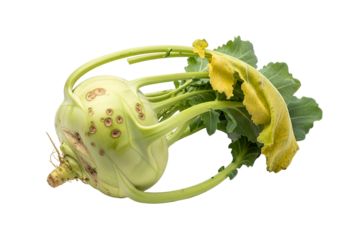 Fresh green kohlrabi vegetable with attached leaves isolated on transparent background