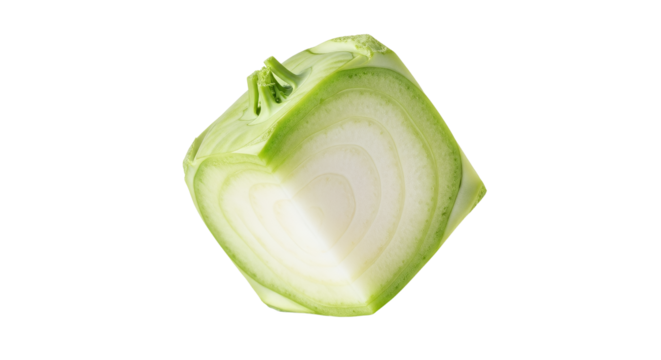 Close-up of a kohlrabi slice revealing subtle variations of light green and white in its flesh, set against a transparent background