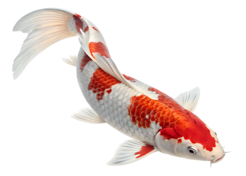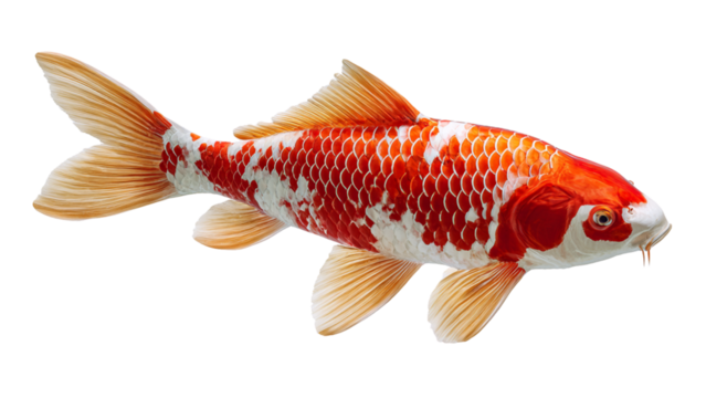 A koi fish leaping, its vibrant scales gleaming, tail curled elegantly, isolated on a transparent background