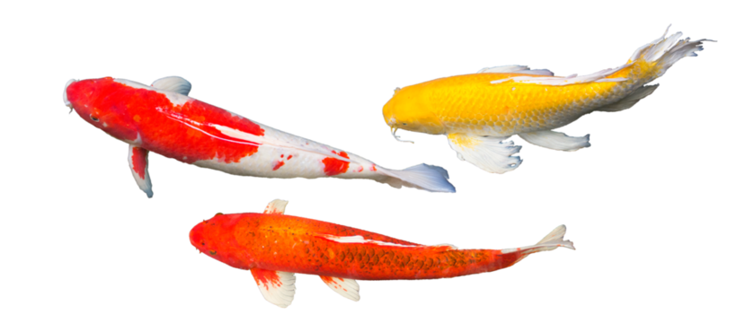 Red and white Kohaku, red Aka Matsuba koi, Yellow Kigoi butterfly koi carp fish are swimming in carp pond, countryside park. Isolated, transparent, PNG file, photograph. Thailand.