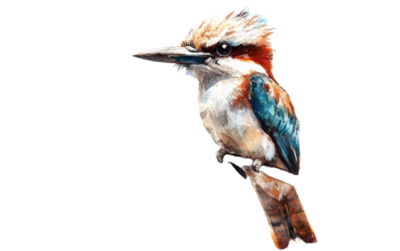 A detailed illustration of a kookaburra bird perched on a small branch showcasing its distinctive plumage and beak isolated on transparent background