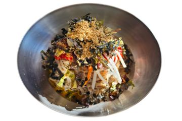 korean bibimbap bowl with galbi beef and pickled vegetables isolated on white background, top view, no depth of field, sharp