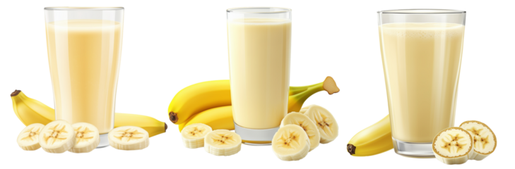 Glass of Korean banana milk smoothie with bananas and slices isolated on white background. Concept of healthy eating