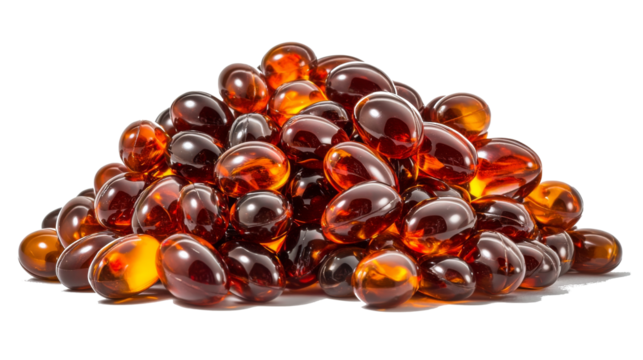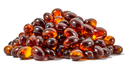 Red krill oil pills or soft gels, arranged on a white background, emphasizing their bright color and the nutritional benefits of omega-3