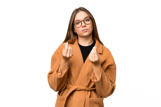 Young blonde woman over isolated chroma key background making money gesture but is ruined