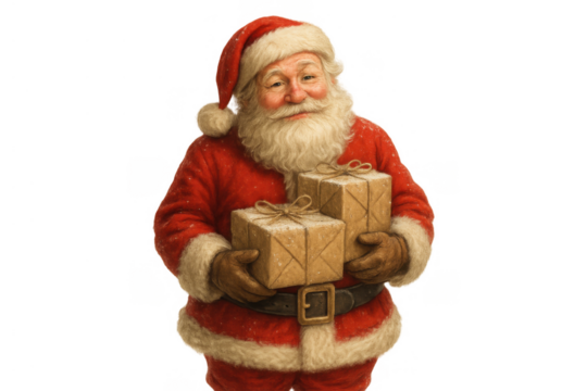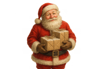 Santa claus holding two wrapped presents, celebrating winter holidays and season's spirit. Transparent background