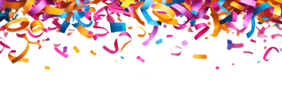 Colorful confetti streamers fall against a black background, creating a festive and celebratory atmosphere.
