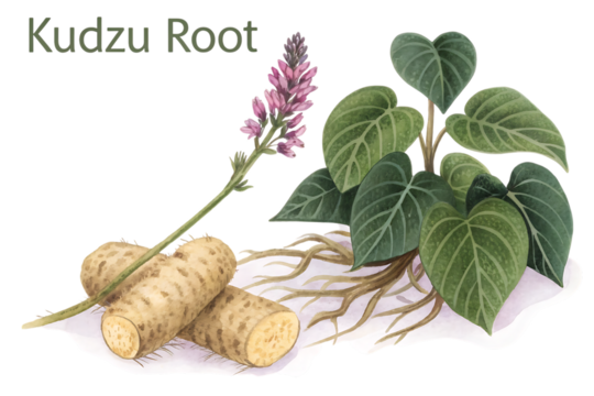 Illustration of kudzu root and plant with flowers and leaves isolated on transparent background