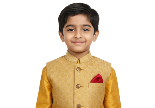 Young indian boy in traditional golden kurta and waistcoat isolated on transparent background