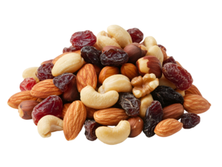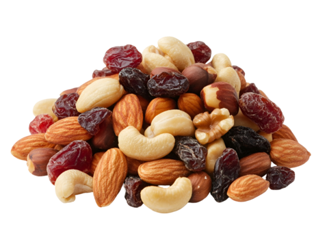 Assorted dried fruits and mixed nuts on a white surface, including almonds, cashews, pistachios, and raisins