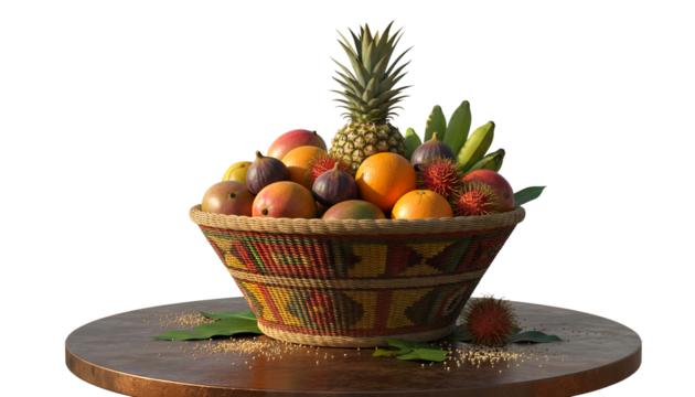 Woven Kwanzaa basket filled with fruits symbolizing abundance unity and cultural heritage isolated on transparent background PNG