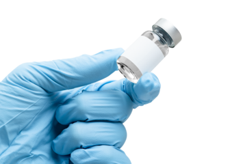 Gloved hand holding a laboratory flask containing blue liquid, symbolizing scientific research, white background.   PNG transparent.