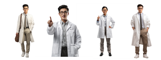 Pharmacist in a white coat, standing confidently in a professional setting, friendly and professional expression, isolated PNG