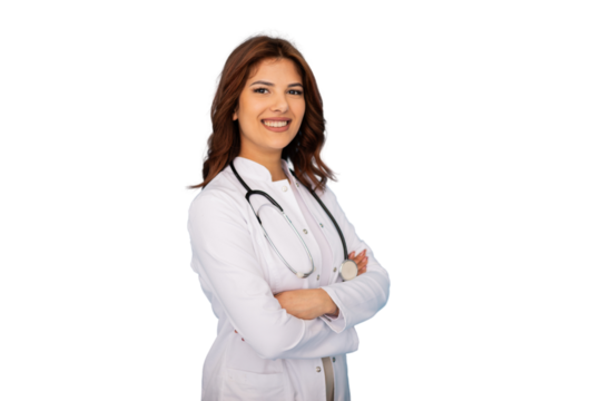 Young female doctor smiling with arms crossed, wearing lab coat and stethoscope, on a transparent background