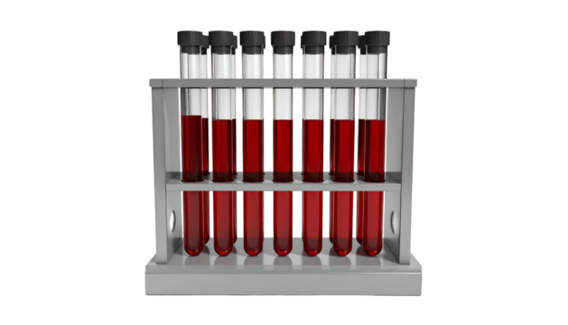 Nine glass vials filled with red liquid, in a lab rack, against a black background