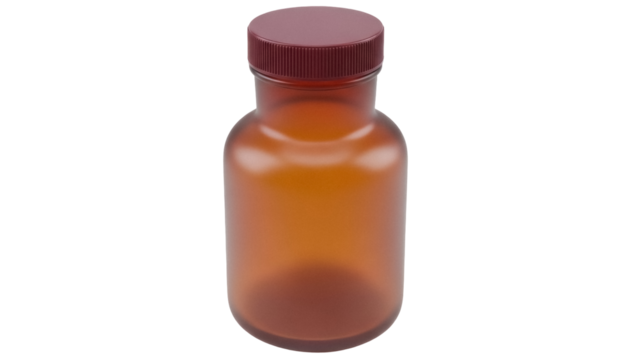 Amber glass bottle with brown cap isolated PNG, vintage medicine container on transparent background for pharmaceutical and laboratory use